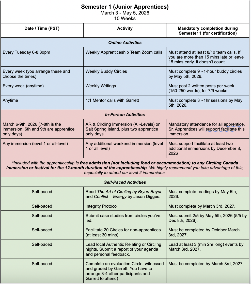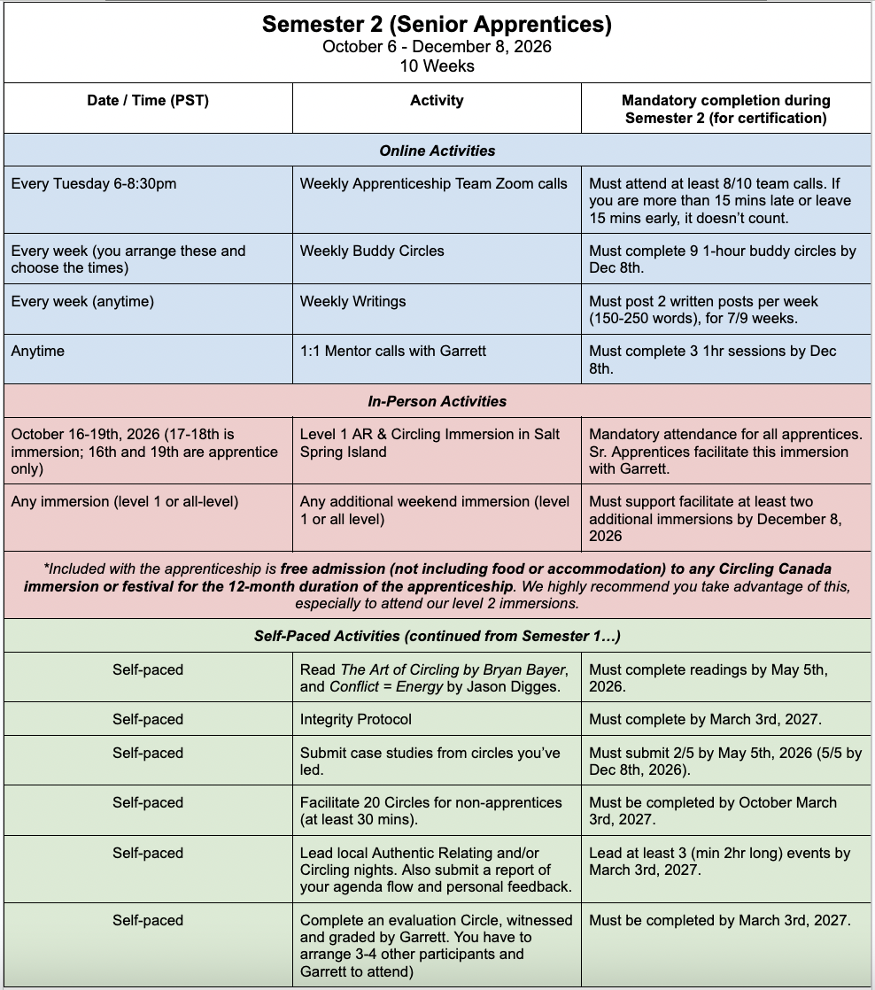 We kick off each semester with a 4-day immersion that includes 2 apprentice-only days with leading an actual 2-day immersion together. During the 12 months of the apprenticeship, you have free admission to attend any Circling Canada immersion.In Semester 1, you’ll participate in: